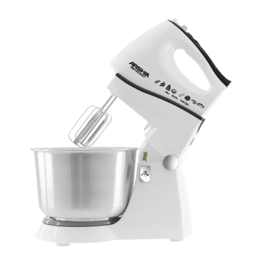 میکسر دستی ARSHIA با کاسه ای که به عنوان یک وسیله خارق العاده برای استفاده روزمره به شما کمک می کند. دستور العمل های مورد علاقه خود را امتحان کنید. این میکسر دستی با داشتن یک موتور 300 واتی و پنج تنظیم سرعت می تواند سخت ترین کارها را با توان مناسب انتخاب شما انجام دهد. میکسر دستی را روی پایه قرار دهید تا دست شما آزاد باشد یا برای کنترل دستی بیشتر از میکسر دستی بدون پایه استفاده کنید. همزن برقی کاسه دار عرشیا دارای کاسه ای از جنس استنلس استیل با ظرفیت 2 لیتر برای مایع و ظرفیت 1 کیلوگرم برای غذای خشک است. با این میکسر آشپزی خود را یک لذت خلاقانه بی دردسر کنید.