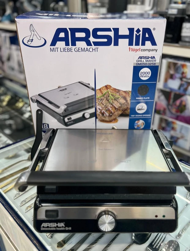 لذت درست کردن غذایی سالم و بدون روغن را با گریل عرشیا مدل GM050-3258 تجربه کنید.این دستگاه با بدنه ای ازجنس آلومنبوم بسیار مقاوم می باشد که به راحتی قابل شستشو نیز هست. این گریل با قدرت 2000 وات این قابلیت را دارد تا غذا را به طور کامل کبابی کند این دستگاه ،دارای دو صفحه گریل از جنس آلومینیوم است که توسط 2 المنت بالای صفحه گریل ،حرارت لازم که برای تهیه کباب و … قرار دارد و درب آن به صورت 180 درجه باز میشود میتوانید به راحتی مواد غذایی مورد نظر خود را کباب پز کنید از دیگر ویژگی های گریل عرشیا میتوان به دسته ی تنظیم حرارت آن اشاره کرد،که بر روی دستگاه قرار دارد و توسط آن می توانید حرارت دستگاه را برحسب نوع پخت خود تنظیم کنید.گریل عرشیا مدل GM050-3258 مجهز به دستگیره قفل شونده حین کار می باشد که موجب می شود غذای شما کامل و بدون ورود هوا کاملا پخته شود.